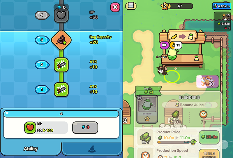 มาดูกันบ้างว่าเกม Chainsaw Juice King มีอะไรให้อัปเกรดกันบ้างเพื่อให้การไล่ล่าผลไม้และธุรกิจร้านน้ำผลไม้ไปได้ไกลกว่าเดิม หลัก ๆ คืออัปเกรดอุปกรณ์ ทั้งเลื่อยไฟฟ้า เครื่องปั่น กระเป๋าขนน้ำผลไม้ รวมไปถึงพนักงาน