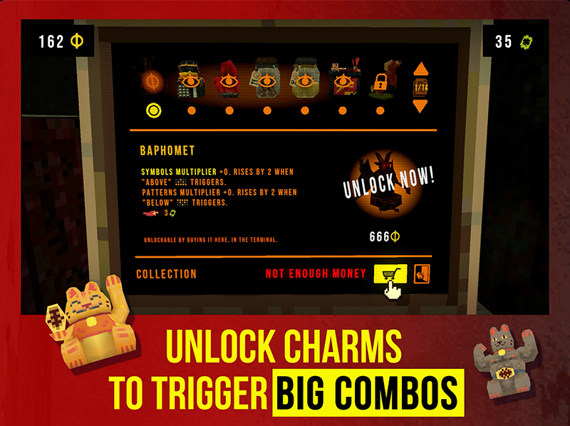 การวางแผนกลยุทธ์และบริหารโชคในเกม CloverPit ก็เช่น การปลดล็อก Charm ซึ่งถือเป็นไอเท็มพิเศษ รวบรวมและจับคู่กับ Charm อื่น ๆ เพื่อสร้างโชคแบบคอมโบ้พิเศษ โยกเครื่องสลอตรับโชคใหญ่ไปเลย