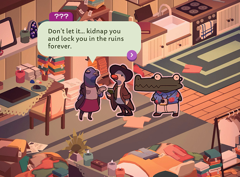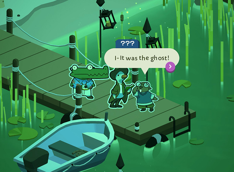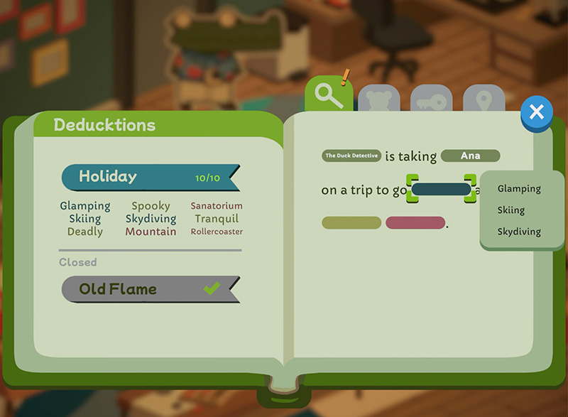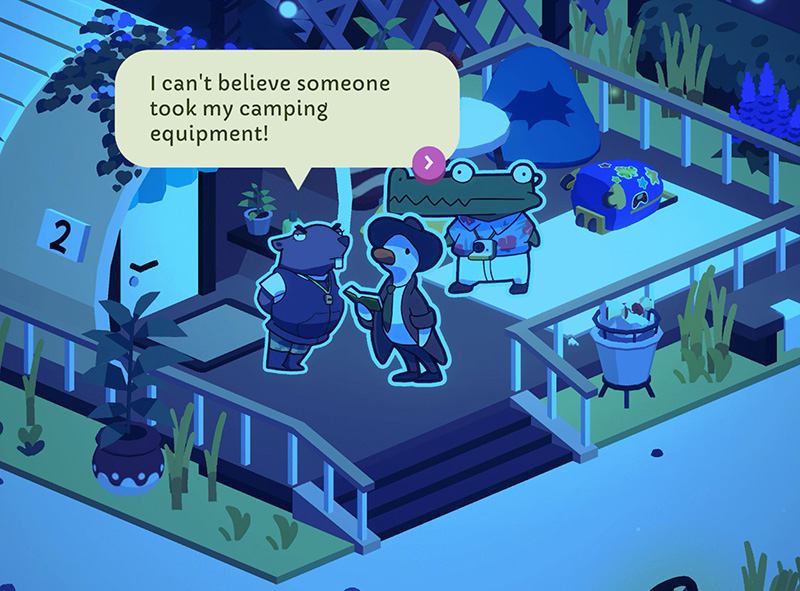 Duck Detective: The Ghost of Glamping จะให้คุณสืบเคสด้วยการเลือกสัมภาษณ์บุคคลที่เกี่ยวข้องหรืออยู่ในสถานที่นั้น ๆ เลือกได้ว่าจะคุยหรือไม่คุยกับใครบ้าง