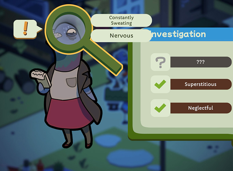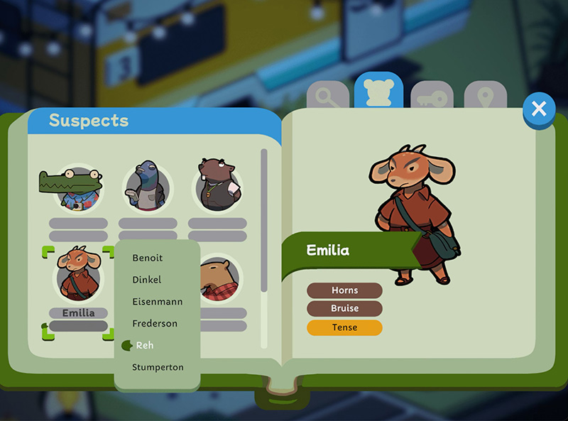 และนี่คือหน้าตาของบันทึกของคุณนักสืบหัวเป็ดแห่ง Duck Detective: The Ghost of Glamping มีให้เลือกว่าคนที่คุยด้วยถูกคุณจัดไว้ในหมวดหมู่ผู้ต้องสงสัยหรือไม่ เพราะเหตุผลอะไร