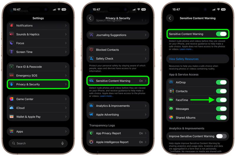 เมื่อฟีเจอร์ ‘แจ้งเตือนเนื้อหาไม่เหมาะสม (Sensitive Content Warning)’ ถูกเปิดใช้งาน iPhone ก็จะใช้ Machine Learning บนตัวเครื่องตรวจสอบภาพโป๊เปลือยหรือไม่เหมาะสมระหว่างที่ใช้วิดีโอคอลบน FaceTime และจะหยุดภาพวิดีโอทันทีที่ตรวจจับความไม่เหมาะสม