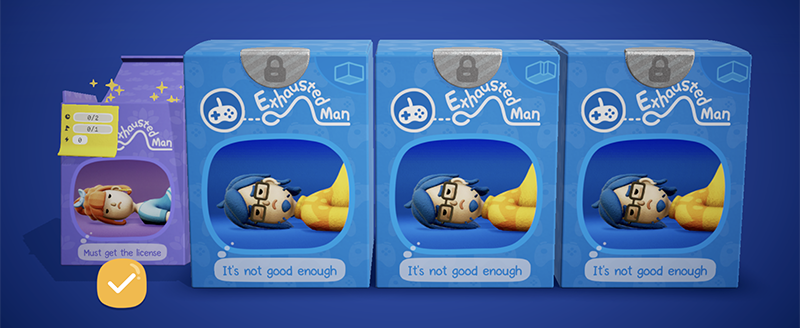 แม้จะเหนื่อยหนักจนแทบสิ้นหวัง แต่เกม Exhausted Man ก็ใส่ประกายไฟมาให้ เป็นชาเลนจ์เล็ก ๆ ในแต่ละสถานการณ์ มักเป็นเป้าหมายลับหรือความสำเร็จที่ซ่อนอยู่ ซึ่งหากกลับไปเล่นจนชนะได้ก็จะได้ไอเท็มตกแต่งห้องหรือไอเท็มแต่งตัวเป็นรางวัลด้วยนะ