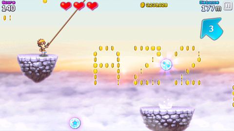 มาถึงเกมที่ต้องใช้ความแม่นยำ และต้องดูแรงลมกันบ้าง ถ้าให้พูดอย่างเดียวบางคนอาจจะนึกถึงเกมตีกอล์ฟ แต่เกมนี้มันเป็นเกมที่ให้คุณโหนเชือกไปหยุดตามพื้นที่ต่างๆ ระหว่างทางก็คอยเก็บสะสมเหรียญไปด้วย โดยคะแนนที่ได้จะมาจากเหรียญและระยะทาง เกมนี้ใครยังไม่เคยเล่น ก็ลองเล่นกันได้ครับ