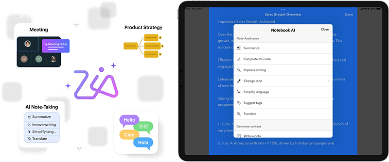 หากคุณเปิดใช้งาน AI ในแอป Notebook – Take notes with AI แอปจะเพิ่มระดับความสามารถไปอีกหลายขั้น เช่น จดบันทึกรายงานการประชุมอัตโนมัติ ทำ Mind Map วางแผนการตลาด จดโน้ตด้วย AI ช่วยให้เขียนโน้ต ด้วยภาษาที่สวยงาม เรียบง่าย เน้นสรุป หรือปรับการเขียนให้ดูเป็นมืออาชีพมากขึ้น รวมถึงยังแปลภาษาได้ด้วย