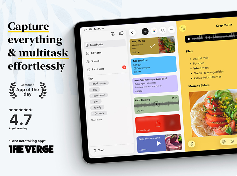 ก่อนจะพูดถึงฟีเจอร์ต่าง ๆ ก็ต้องอวดความนิยมของแอป Notebook – Take notes with AI เสียก่อน ทั้งเป็นทั้ง App of the day และยังได้เรตรีวิวมากถึง 4.7/5 และ The Verge เว็บไซต์ด้านเทคโนโลยีก็ยังยกให้เป็น Best notetaking app หรือแอปจดโน้ตที่ดีที่สุด!