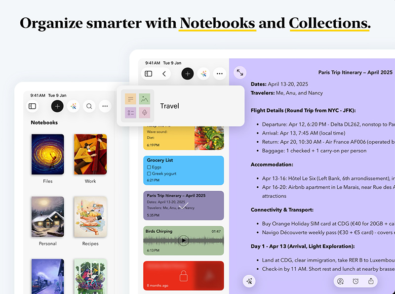 จุดเด่นของแอป Notebook – Take notes with AI คือเป็นแอปจดโน้ตที่สามารถจัดระเบียนสมุดโน้ตและการเก็บข้อมูลได้ง่ายและฉลาดมากขึ้น แยกหมวดหมู่จัดเจน เพิ่มสมุดได้หลายเล่ม ทั้งยังมีฟีเจอร์ช่วยจัดการรูปแบบและเนื้อหาที่จดโน้ตเอาไว้อย่างเป็นระเบียน ชัดเจน และเข้าถึงได้อย่างรวดเร็ว