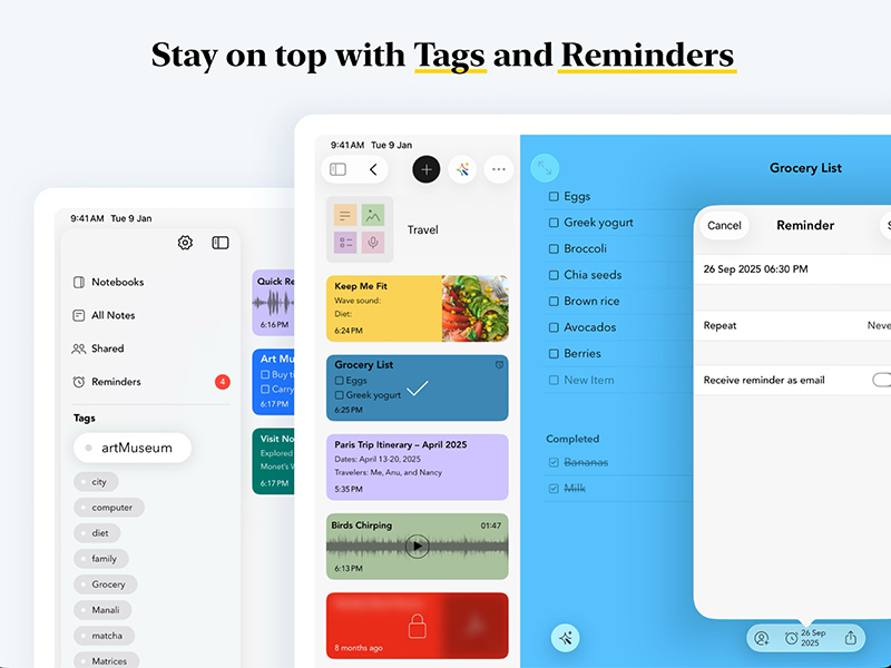 เริ่มกันที่ฟีเจอร์ของ Notebook – Take notes with AI ที่ช่วยจัดระบบระเบียบชีวิต เช่น Tags ที่จะแยกประเภทการจดโน้ตให้เป็นหมวดหมู่ เรียกขึ้นมาดูได้ทั้งกลุ่ม และ Reminders ก็ยังช่วยแจ้งเตือนโน้ตตามวันและเวลาที่คุณต้องค่าเอาไว้ งานจะได้ไม่หลุด