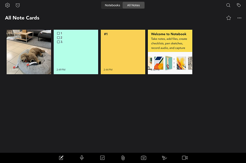 หน้าตาของแอป Notebook – Take notes with AI เมื่อกดเข้าไปในสมุดโน้ต (Notebook) โดยจะแบ่งโน้ตต่าง ๆ เป็นการ์ดโน้ต (Note Card) ซึ่งจะแยกตามประเภทของการ์ด เช่น เขียน บันทึกเสียงสด รายการ Todolist เปิดไฟล์ เปิดรูปภาพ ภาพวาดสเกตช์ บันทึกวิดีโอ ซึ่งการ์ดเหล่านี้สามารถปรับแต่งสีพื้นของการ์ดได้ตามต้องการ