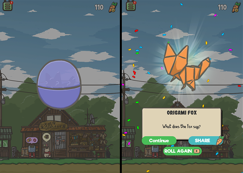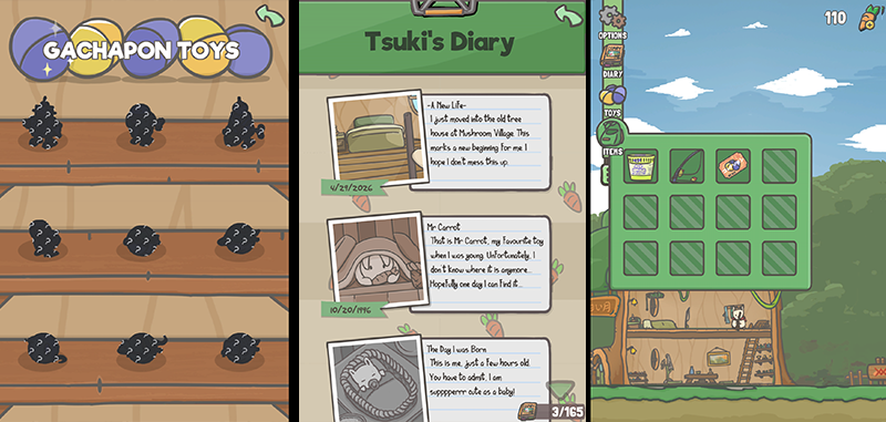Tsuki ยังมีกิจกรรมให้ทำเยอะเลยละ ไม่ใช่แค่เก็บแครอตกับตกแต่งบ้านต้นไม้ ขอเสนออันที่สนุกที่สุดก่อนเลยแล้วกัน คือสุ่มกาชาปองรับไอเท็มลับ ตัวตู้กดกาชาปองตั้งอยู่หน้าร้านขายของชำ แวะไปกดกันได้เลย